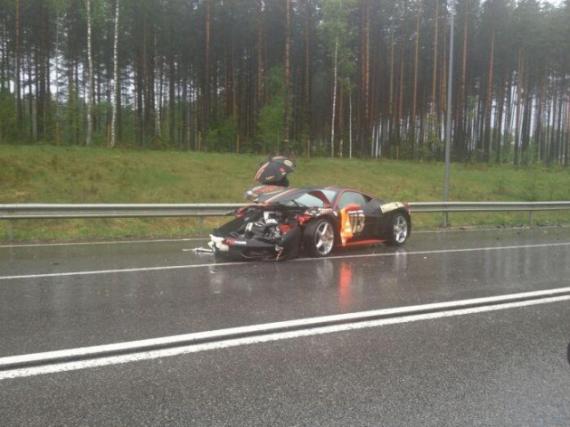 Do zdarzenia doszło na łotewskich drogach przy bardzo złej pogodzie. Rzęsiście padający deszcz spowodował, iż kierowca jadący podobno przepisową prędkością, nie opanował auta, poważnie je uszkadzając. Co ważne, podróżujący Ferrari nie odnieśli żadnych obrażeń. Pierwszym rozbitym samochodem był Lamborghini Murcielago LP670. Dziś Gumball 3000 zawitał do Polski.