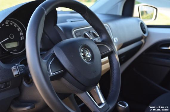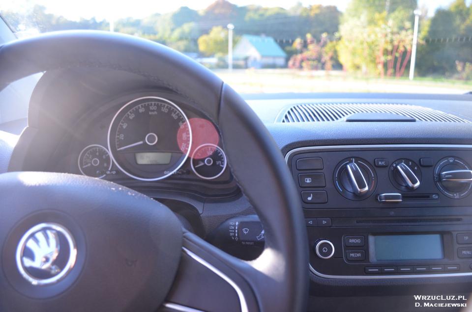 Obszerne wnętrze to już niemal znak rozpoznawczy Skody. Nie inaczej jest w przypadku Citigo. Zarówno kierowca, jak i pasażer nie mogą narzekać na ciasnotę. Fotele są jednymi z najlepszych w klasie, a drugi rząd siedzeń nie jest przeznaczony wyłącznie dla dzieci. Jak na ten segment, miejsca jest aż nadto. Co więcej, dodatkowa para drzwi znacznie podnosi funkcjonalność. Niestety, wnętrze to miejsce, na którym najbardziej widać poczynione oszczędności. Goła blacha to zdecydowanie największy minus. Szkoda, że nie jedyny. Materiały użyte do wykończenia deski rozdzielczej, chociaż dobrze spasowane, są twarde i nieprzyjemne w dotyku. Wielofunkcyjna kierownica jest niedostępna. Aby upuścić elektryczną szybę z prawej strony, trzeba sięgnąć do drzwi pasażera. Ekran komputera jest żywcem wyjęty z kalkulatora, a w bagażniku nie ma lampki. Można odnieść wrażenie, iż mamy do czynienia z autem o co najmniej 10 lat starszym.